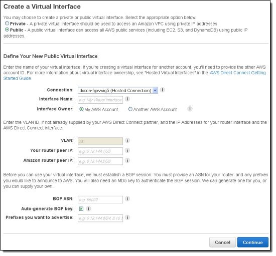 If you look closely at the screen shot above, you will see that you can now set the IP address of the Amazon router. You can also choose to supply your own BGP key. Both of these features provide you with additional control and will let you choose addresses and keys that are in alignment with your organization’s policies.