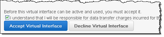 You can now create Virtual Interfaces for multiple AWS accounts on a single 1 Gigabit or 10 Gigabit Connection. If you have VPCs owned by different AWS accounts, you can now create multiple Virtual Interfaces and share the underlying connection. When you share a Virtual Interface with another account, the state of the Interface (as seen by the new account) will be shown as “pending acceptance” until the invitation is accepted: