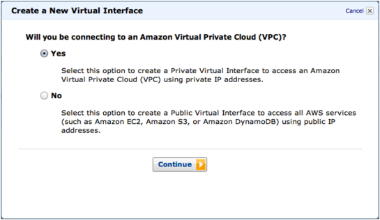 You can then create a Virtual Interface to your connection. The interface can connected to one of your Virtual Private Clouds or it can connect to the full set of AWS services: