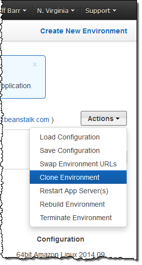 You can now use an existing Elastic Beanstalk environment as the basis for a new one by simply cloning and then editing it. Cloning an environment also creates copies of any AWS resources associated with it (it does not, however copy data stored in Amazon RDS to the clone). As part of the cloning process you have the opportunity to update the Environment Name, Environment URL, Description and Platform values to reflect the new environment. You will use the same language and framework when you update the Platform and can choose a newer version of the same solution stack.