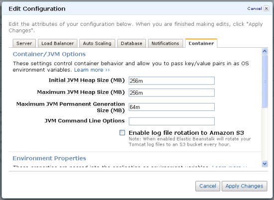 - Container – The settings in this tab are peculiar to each container type. With the default (Java / Tomcat 6) container, this tab lets you control the size of the Java Virtual Machine’s heap and garbage collection parameters. You can also pass any desired arguments directly to the JVM. You can also choose to make your AWS credentials and a JDBC connection string available within each running EC2 instance.