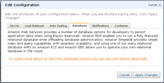 The Database tab provides information about the database options available to your Elastic Beanstalk application.