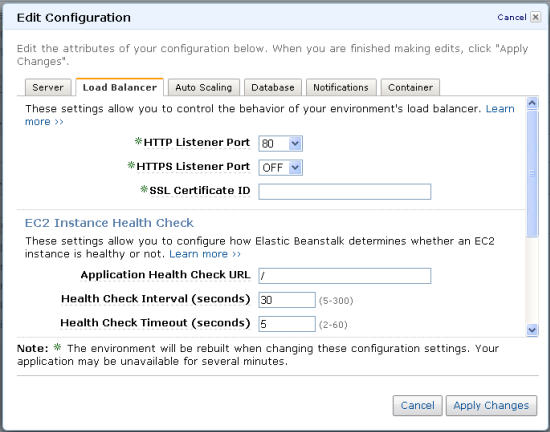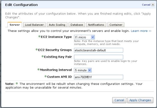 You can also view and edit all of the configuration settings for each of your environments. The default settings will work well under a wide variety of conditions and are a good place to start if you are not very familiar with AWS. Let’s take a look at each of tabs.