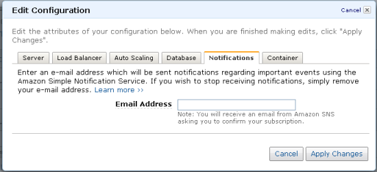 - Notifications – An email address that can receive notification of important application events such as scale-up and scale-down actions initiated by Auto Scaling.