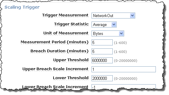 - Auto Scaling – Minimum and maximum instance count, and nine settings for the trigger that is used to drive scaling decisions.