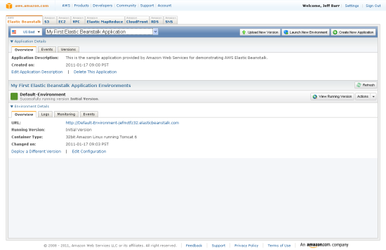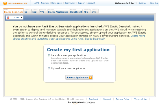 Here is the new Elastic Beanstalk tab on the Console. You can launch a sample application and use it to learn more about Elastic Beanstalk or you can upload your own application’s WAR file.