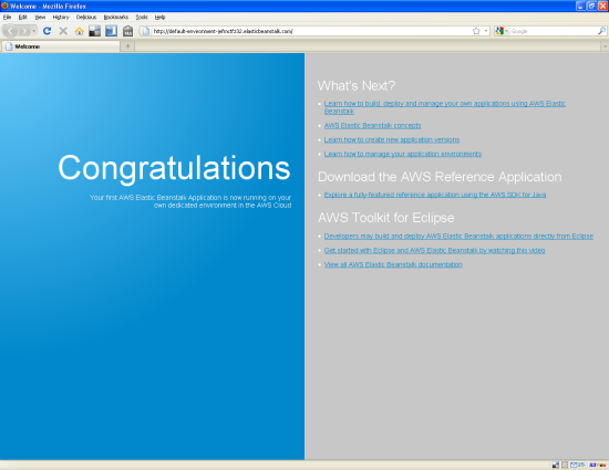 The sample application provides you with links to additional Elastic Beanstalk resources:
