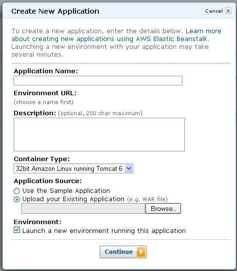 This will create a new war file, named after your application, located in the root directory of your application. Head over to the AWS Management Console, click on the Elastic Beanstalk tab, and select ‘Create New Application’. Setup your Elastic Beanstalk application with a name, URL and container type, then upload the Rails war file.