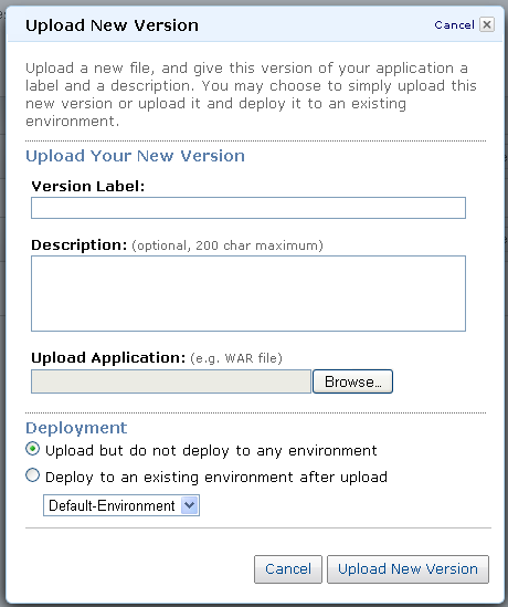 - Select Upload and use a new application version and use the Browse button to locate the new version of your application.