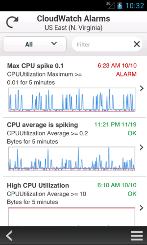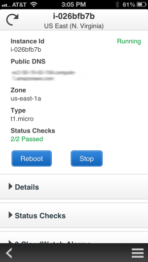 Were now pleased to announce the availability of the AWS Console for iPhone! The app summarizes the status of your EC2 instances, CloudWatch alarms, total service charges, and AWS Service Health. You can view all of your EC2 instances, filter and search for a specific instance, view instance details, and stop or reboot an instance. You can also filter and search for CloudWatch alarms and view CloudWatch metrics to monitor the health of your resources. As with the web-based management console, sign-in is as simple as entering your AWS or IAM credentials.