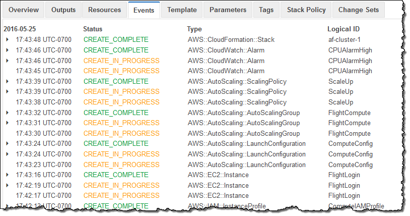 I confirmed my choices and gave CloudFormation the go-ahead to create my cluster. As expected, the cluster was all set up and ready to go within 5 minutes. Here are some of the events that were logged along the way: