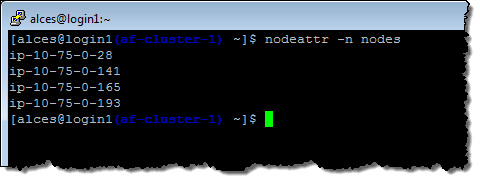 After I launched my cluster I realized that this post would be more interesting if I had more compute nodes in my cluster. Instead of starting over, I simply modified my CloudFormation stack to have 4 nodes instead of 1, applied the change, and watched as the new nodes came online. Since I specified the use of Spot Instances when I launched the cluster, Auto Scaling placed bids automatically. Once the nodes were online I was able to locate them from within my PuTTY session: