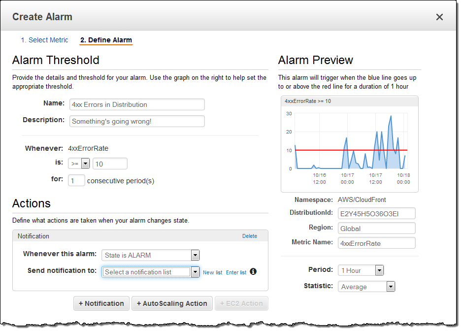 Once I track this down (a task that will have to wait until after AWS re:Invent, I will set an Alarm as follows: