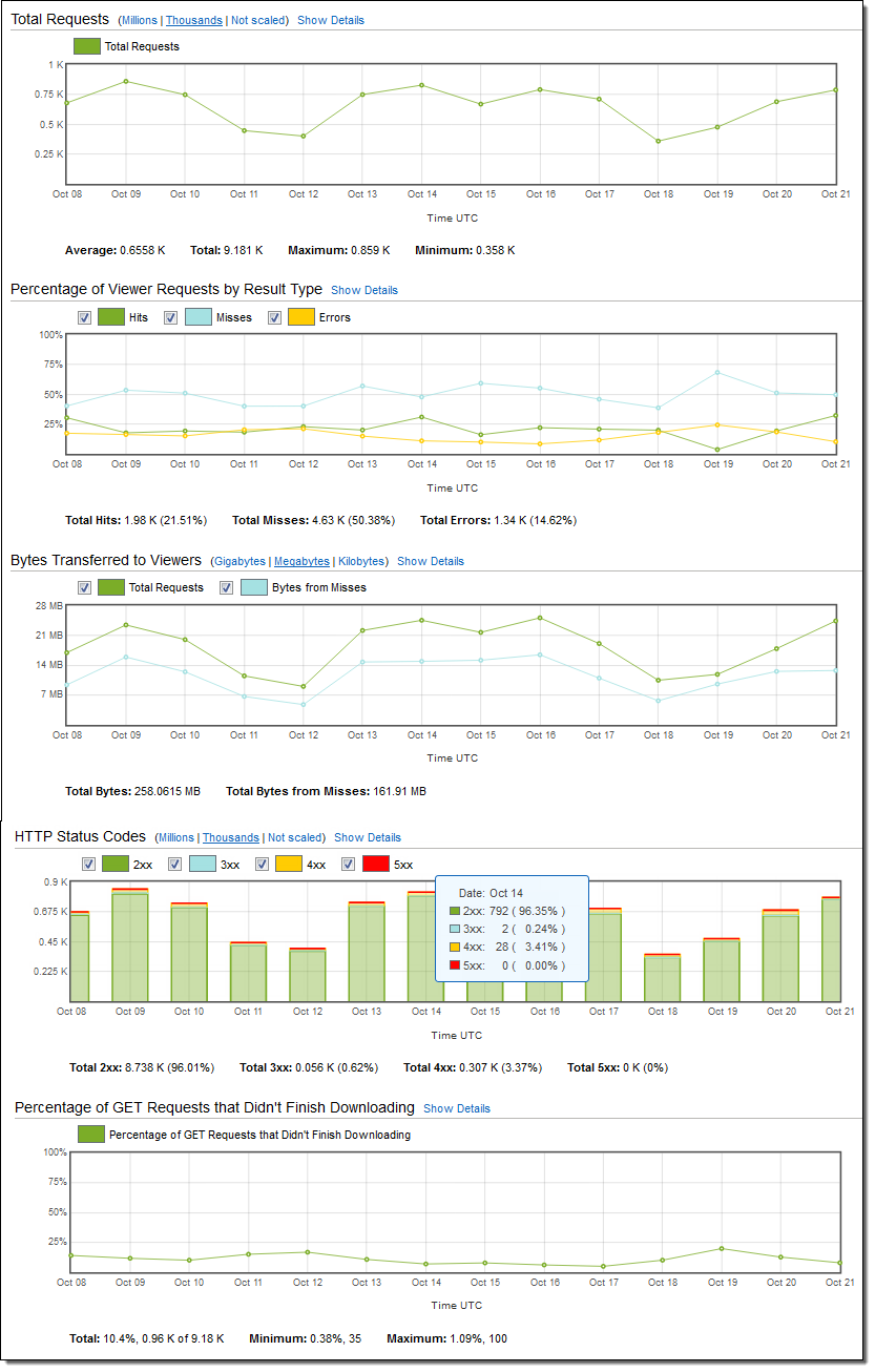 - Percentage of Viewer Requests by Result Type – This report shows cache hits, misses, and errors as percentages of total viewer requests.
