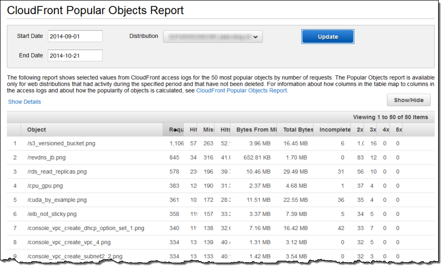 The new Popular Objects report shows request count, cache hit and cache miss counts, as well as error rates for the 50 most popular objects during the specified period. This helps you understand which content is most popular among your viewers, or identify any issues (such as high error rates) with your most requested objects. Here’s a sample report from one of my distributions: