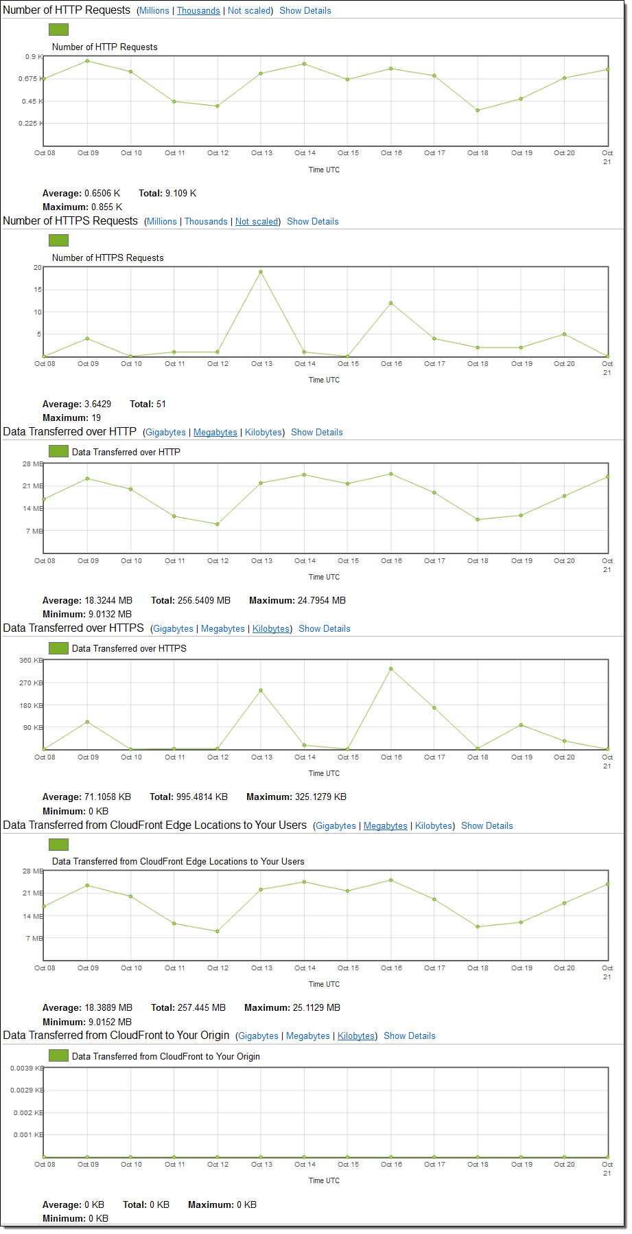 We launched a set of CloudFront Usage Charts back in March. The charts let you track trends in data transfer and requests (both HTTP and HTTPS) for each of your active CloudFront web distributions. Data is shown with daily or hourly granularity. These charts are available to you at no extra charge. You don’t have to make any changes to your distribution in order to collect the data or to view the charts. Here is a month’s worth of data for one of my distributions: