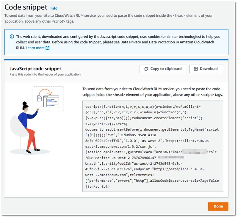 Amazon CloudWatch RUM will help you to collect the metrics that give you the insights that will help you to identity, understand, and improve this experience. You simply register your application, add a snippet of JavaScript to the header of each page, and deploy. The snippet runs when your users step through each page of your application, and sends the data to RUM for consolidation and analysis. You can use this tool on its own, and in conjunction with both Amazon CloudWatch ServiceLens and AWS X-Ray.