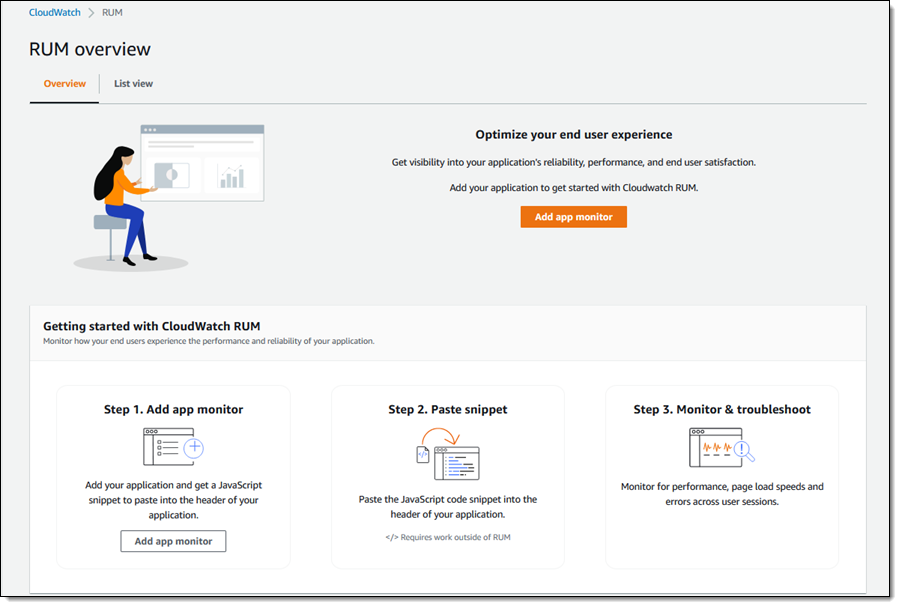 To get started, I open the CloudWatch Console and navigate to RUM. Then I click Add app monitor: