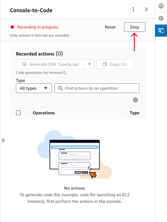 - The Recorded actions table in AWS Console-to-Code only display actions taken during the current session within the specific browser tab, and it does not retain actions from previous sessions or other tabs. Note that refreshing the browser tab will result in the loss of all recorded actions.