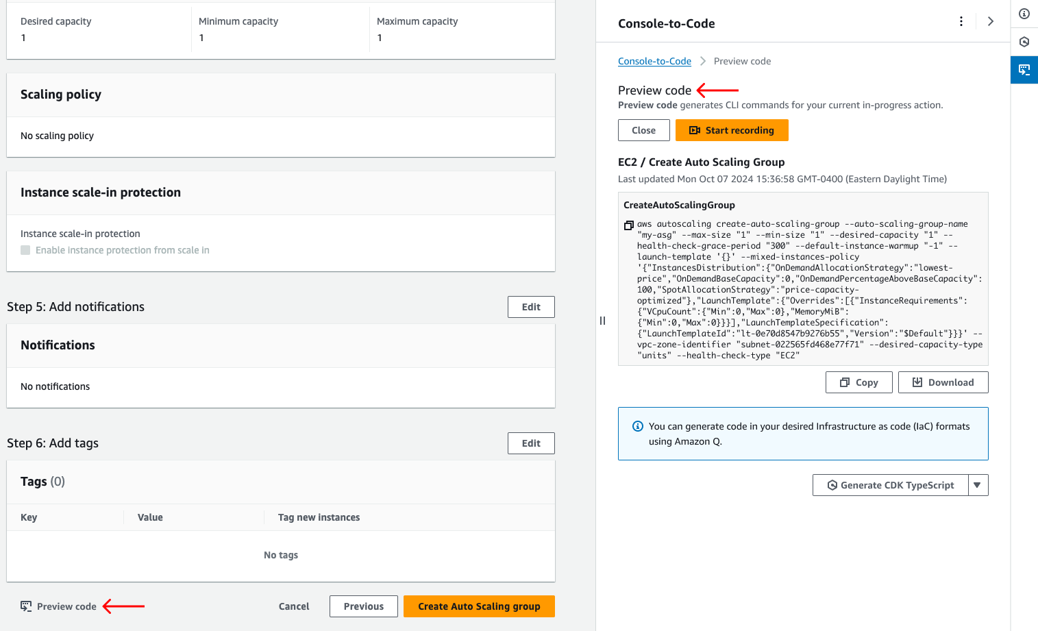 You can also directly access AWS Console-to-Code from Preview code feature in Amazon EC2 and Amazon EC2 Auto Scaling group launch experience. This means that you don’t have to actually create the resource in order to get the infrastructure code.