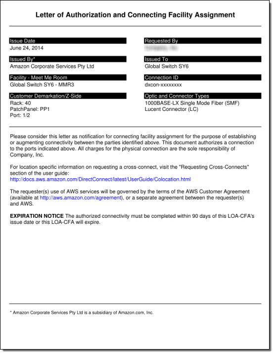 Behind the scenes, this will generate an authorization document and assign a Direct Connect port at Global Switch to you (assuming that you choose this new location):