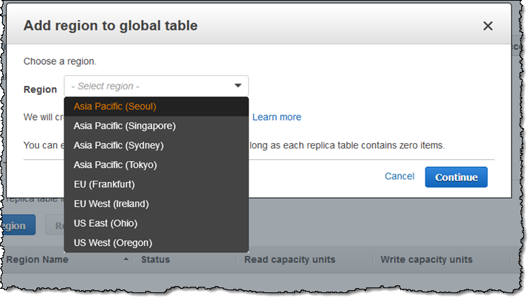 Global tables can be used in nine AWS Regions (we recently added support for three more) and can be set up when you create the table: