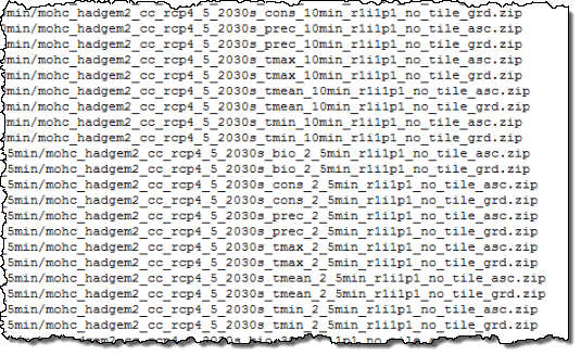 The GCM data comes from the CCAFS Climate Portal and is stored in Amazon S3 at s3://cgiardata (refer to the CCAFS-Climate Data page for more info). There’s about 6 TB of data in the bucket, spread out over 66,000 or so files in ESRI Grid and ARC ASCII GRID format, all zipped. You can download the desired data to an EC2 instance using the AWS Command Line Interface (AWS CLI) or the AWS Tools for Windows PowerShell. The GCM Documentation contains additional information about the structure of the data. The following diagram (click for a larger copy) will help you to identify the files that you need: