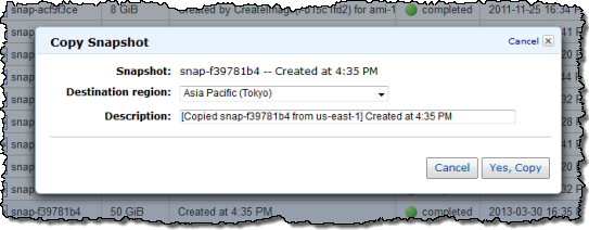 Other than the speed and efficiency benefits mentioned above, this change is transparent and you need not do anything special in order to take advantage of it if you are making copies using the AWS Management Console, the ec2-copy-snapshot or ec2-copy-image commands, or the CopySnapshot or CopyImage API.