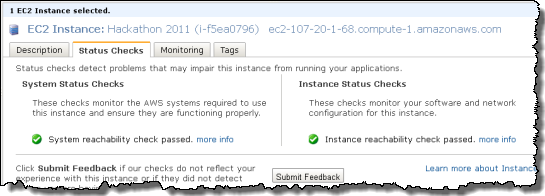 You can now view status checks to help identify problems that may impair an instances ability to run your applications. These status checks are the results of automated tests performed by EC2 on every running instance that detect hardware and software issues. Whether you are running applications on AWS or elsewhere, diagnosing problems quickly and accurately can be difficult. For example, to determine that a faulty boot sequence has crashed before it initialized an instances networking stack or that an instance has failed to renew its DHCP lease, it helps to confirm first that the instance is powered on, and all networking equipment is performing as expected.