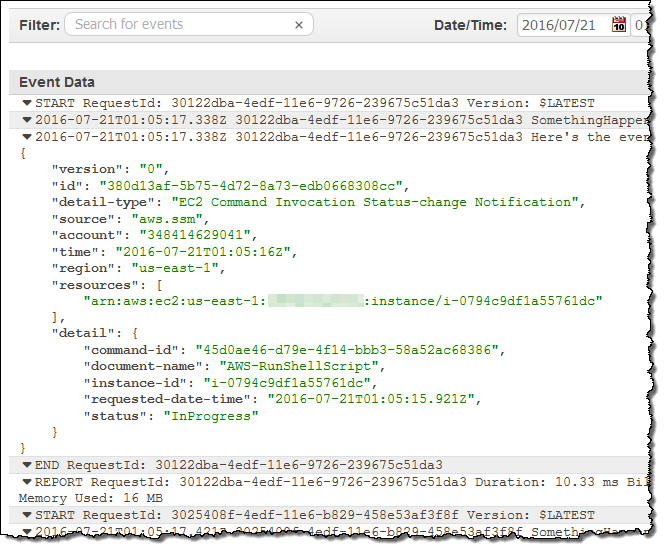 In order to support this really important use case, you can now arrange to be notified when the status of a command or a code block within a command changes. In order to provide you with several different integration options, you can receive notifications via CloudWatch Events or via Amazon Simple Notification Service (Amazon SNS).