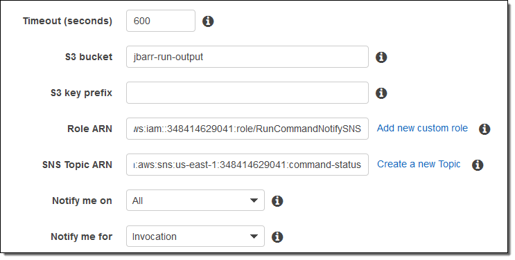 Following the directions (Monitoring Commands), I created an S3 bucket (jbarr-run-output), an SNS topic (command-status), and an IAM role (RunCommandNotifySNS) that allows the on-instance agent to send notifications on my behalf. I also subscribed my email address to the SNS topic, and entered the command: