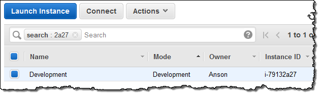 In the examples that follow, I will filter my instances using the tags that I assigned to the instances. I’ll start with simple examples and work up to some more complex ones. I can filter by keyword. Let’s say that I am looking for an instance and can only recall part of the instance id (this turns out to be a very popular way to search). I enter the partial id (“2a27”) in to the filter box and press Enter to find it: