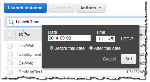 I can even filter by launch date to find instances that are newer or older than a particular time: