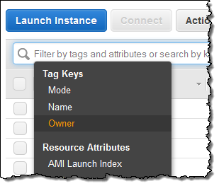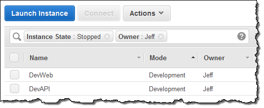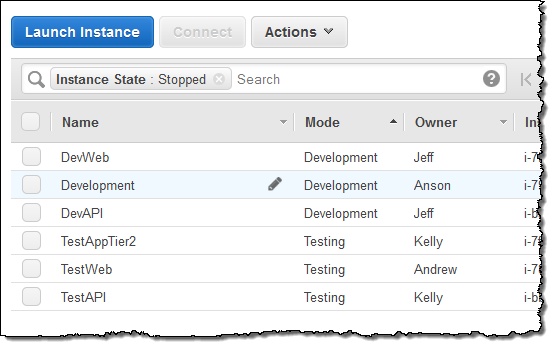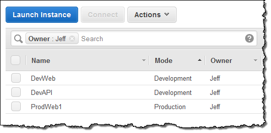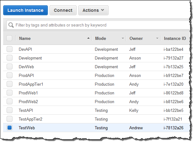 Regardless of the manner in which you launch them, you probably want to track the role (development, test, production, and so forth) internal owner, and other attributes of each instance. This becomes especially important as your fleet grows to hundreds or thousands of instances. We have long supported tagging of EC2 instances (and other resources) for many years. As you probably know already, you can add up to ten tags (name/value pairs) to many types of AWS resources. While I can sort by the tags to group like-tagged instances together, there’s clearly room to do even better! With today’s launch, you can use the tags that you assign, along with the instance attributes, to locate the instance or instances that you are looking for.