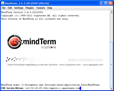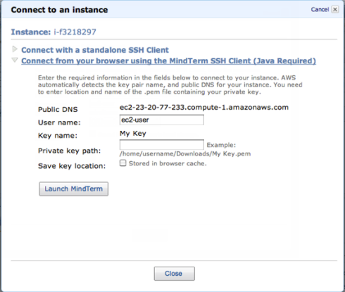 We’ve integrated the MindTerm SSH client into the AWS Management console to simplify the process of connecting to an EC2 instance. There’s now second option on the Connect window: