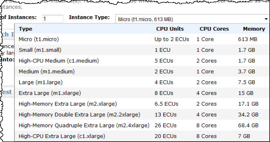- 1 virtual core running at 2 ECU (EC2 Compute Unit)