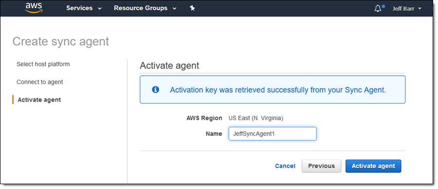 This step retrieves the activation key from the sync agent. After it completes, I enter a name for it and click Activate agent to proceed: