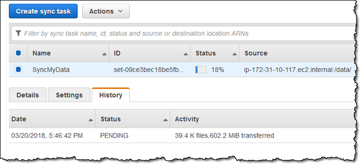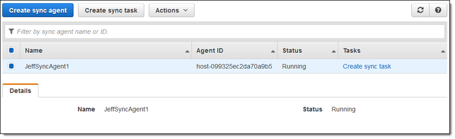 Now that the agent is running and activated, I click on Create sync task to start moving some files to EFS: