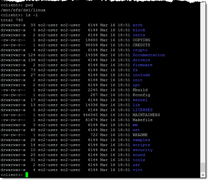 In order to write this blog post, I launched an EC2 instance, exported an NFS file system (/data), and populated the file system with the Linux kernel source code.