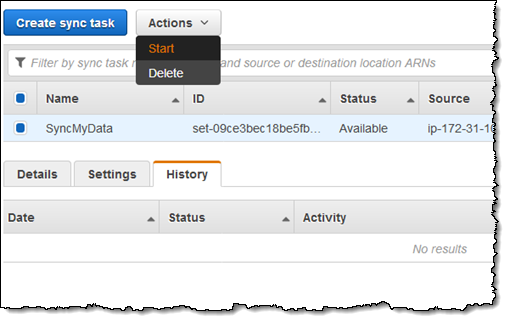 After the sync task has been created and its status becomes Available, I can select it and choose Start from the Actions menu to initiate a sync: