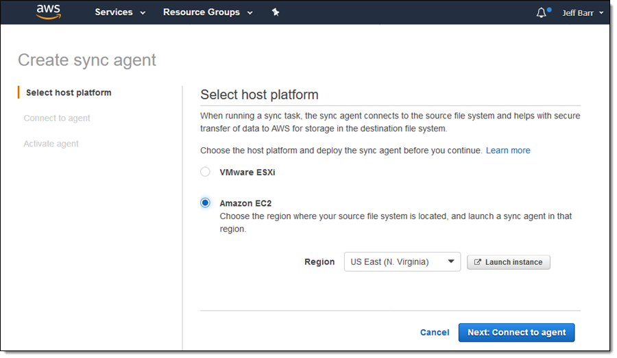 EFS File Sync uses a secure, highly parallel data transfer mechanism that can run up to 5 times faster than the tools I mentioned above. It is available as an agent that runs within VMware ESXi or on an EC2 instance, and accesses the source file system via NFS (v3 and v4), and can be used in all AWS Regions where EFS is available. Because the agent is responsible for initiating all communication with AWS you don’t need to set up VPNs or allow inbound connections through your firewall.