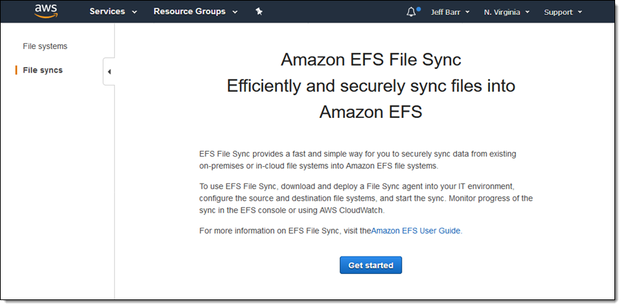 If you were using EFS File Sync previously, your EFS File Sync resources have been migrated to AWS DataSync. When you go to the AWS DataSync Management Console you will see them under the Tasks, Locations, and Agents pages linked from the left navigation. If you have any questions about this transition, please contact AWS Support.