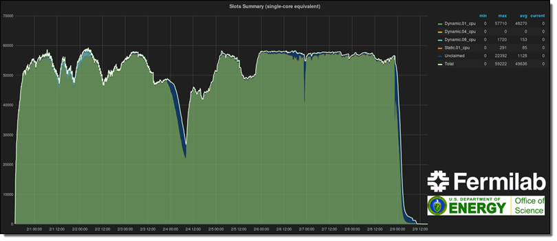 The figure below shows elastic, automatic expansion of Fermilab’s Computing Facility into the AWS Cloud using Spot instances for CMS workflows. Monitoring of the resources was done using open source software provided by Grafana with custom modifications provided by the HEP Cloud.