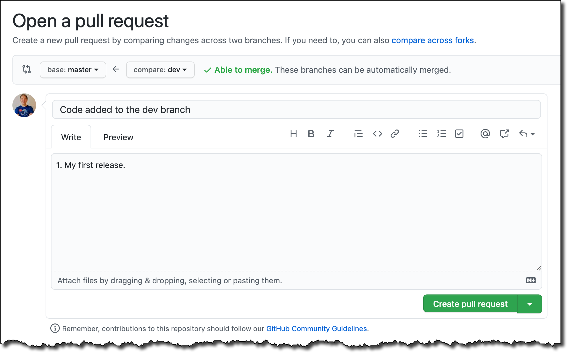 In the GitHub console, I open a new pull request by comparing changes across the two branches, master and dev. I verify that the pull request is able to merge, then I create it.