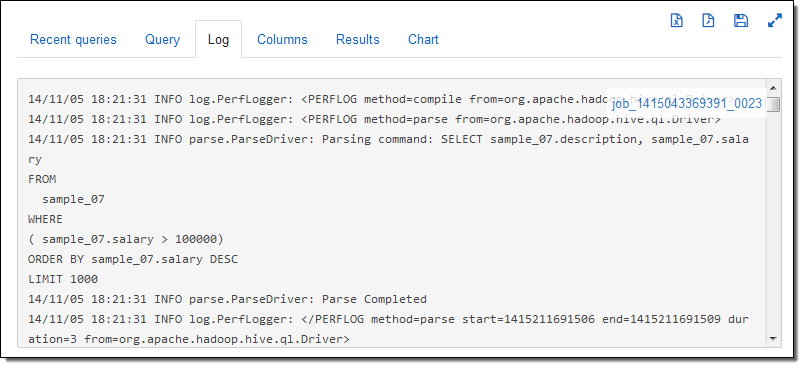 I can view and edit the query, and then run it on my cluster with a single click of the Execute button. After I do this, I can inspect the logs as the job runs: