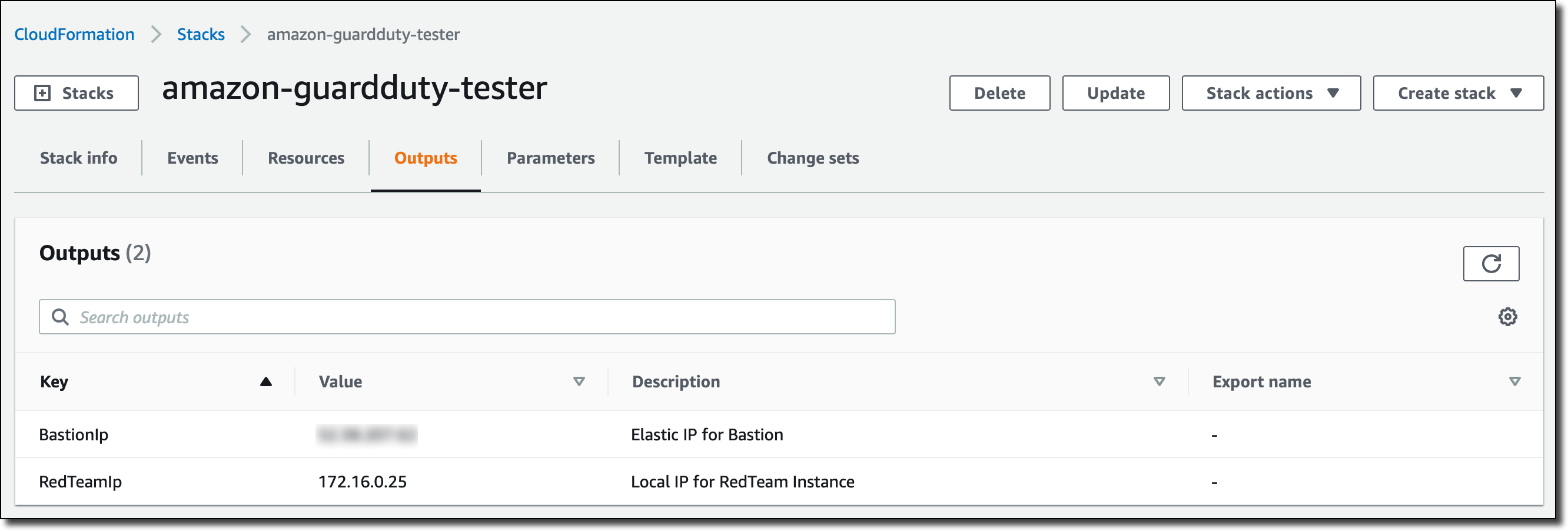 First, I use the included CloudFormation template to launch an Amazon Elastic Compute Cloud (Amazon EC2) instance in an Amazon Virtual Private Cloud (Amazon VPC) private subnet. The stack also includes a bastion host to provide external access. When the stack has been created, I write down the IP addresses of the two instances from the stack output.