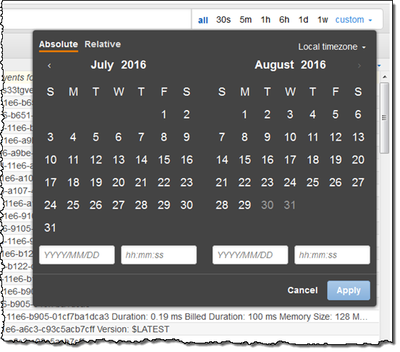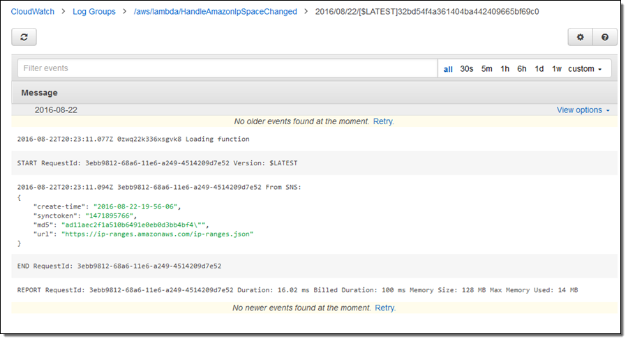 We have also improved the display of log data across all streams within a log group. Once you select a Log Group and click Search Events you can see the log data from all streams with that log group. For example, I can easily identify the Billed Duration for multiple invocations of a single Lambda function: