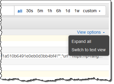 Open up the CloudWatch Logs Console, click on a Log Group, and then on a Log Stream within the group. Find the View options menu on the right: