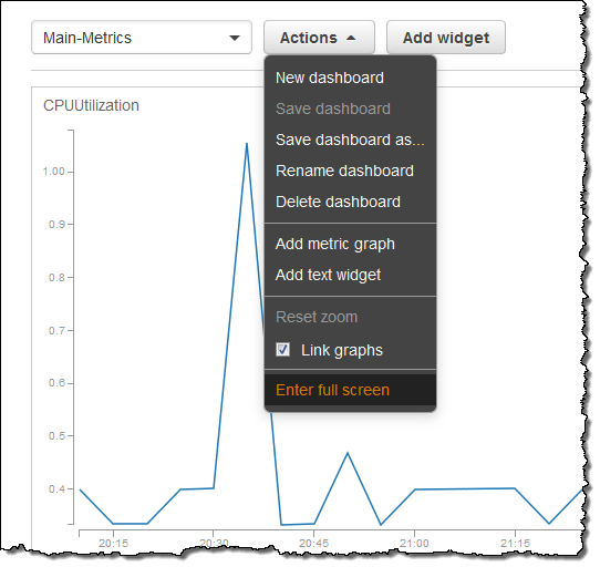 You may have already noticed the improvements that we recently made to the CloudWatch Dashboards. First, there’s a new full screen mode for Dashboards, accessible by clicking on Enter full screen in the Actions menu: