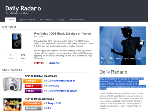 The Daily Radario displays the top 10 products from Amazon.com and a number of other sources. As the site says, “Daily.radario.com is the source for informative and entertaining top 10 charts, tracking the most popular products like digital cameras & MP3 players to the most frequently purchased music and movies.”